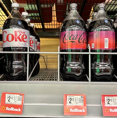Walmart の中で、コーラの 2 L が、$ 2.68 から値下げで $ 2.24 に。