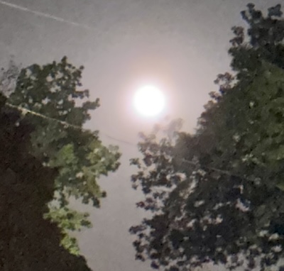 庭に出てみたら、大きな満月だけど、木の枝の影に隠れて綺麗に見えない。