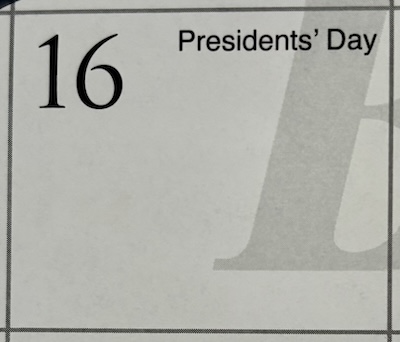 カレンダーを見ると、今日の月曜日が振替の “Presidents’Day”になっている。